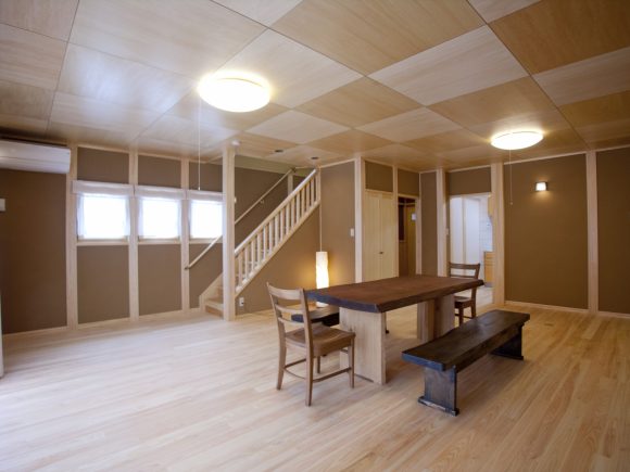 床は無垢の桧板、壁は珪藻土、天井はシナベニアの目透かしばりです。