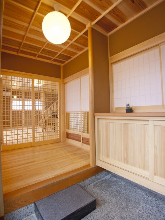 玄関ホールは2枚戸の両面組子の框戸です。