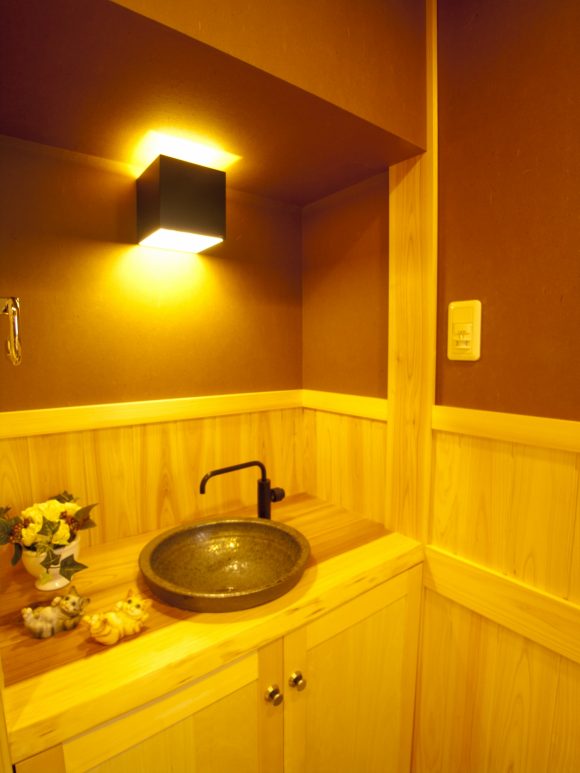 壁天井には桧の無垢板に防水性のある木肌美人という塗料を塗りました。