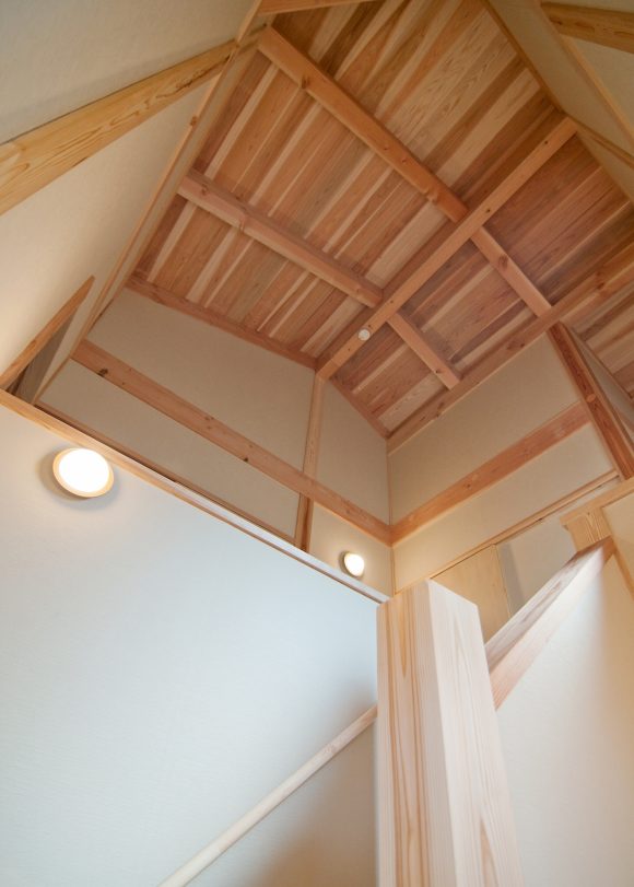 2本の桧のお父さん柱(21 センチ角)お母さん柱(18 センチ角)が家を支えます。