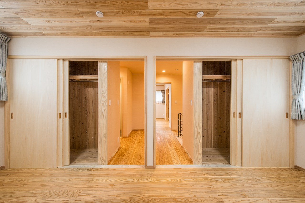 リビングを中心に扇型に各部屋に行けるようにしています。