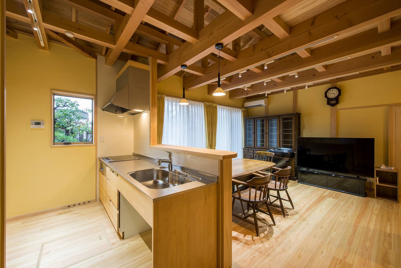 化粧梁見せで勾配天井で杉の上小板も見せています。