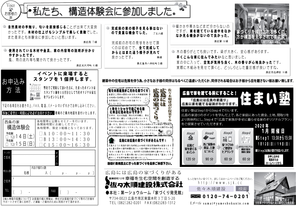 こちらのイベントは終了しました。 【開催日時】 2019年12月14日(土)15日(日)予約制 A 10:00~11:30 B 13:00~14:30 C 15:00~16:30 【開催場所】 東広島市西条町寺家付近 申し込み後に詳細の地図を送付いたします。 【人数・ご費用】 各時間帯限定3組様。 参加は無料です。 【申込み方法】 下記のお申し込みフォームから または、通話料無料のフリーダイヤル 0120ー740ー201まで 開催詳細内容 詳細はこちら↓をご覧ください。