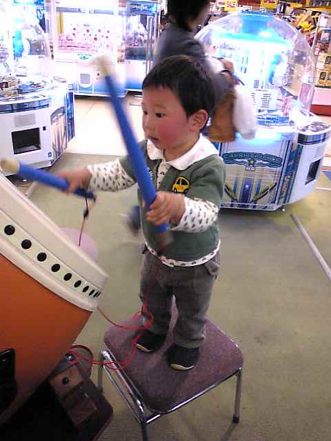 本当は100円を入れて音楽に合わせて太鼓をたたくゲームなのですが、そこらはまだ分からないようで、お金を入れなくてもたたきまくって満足のようです。