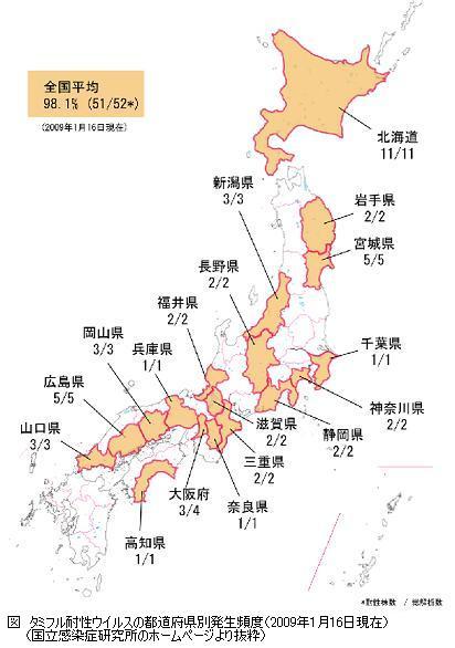 昨シーズン、タミフル耐性ウイルスは1734株中45株で、全体の2.6%にすぎなかったのですが。今シーズンは、現時点で既に18道府県でタミフル耐性ウイルスが分離されており、H1N1型ウイルスのほとんどがタミフル耐性で広島では100%タミフル耐性の様です。