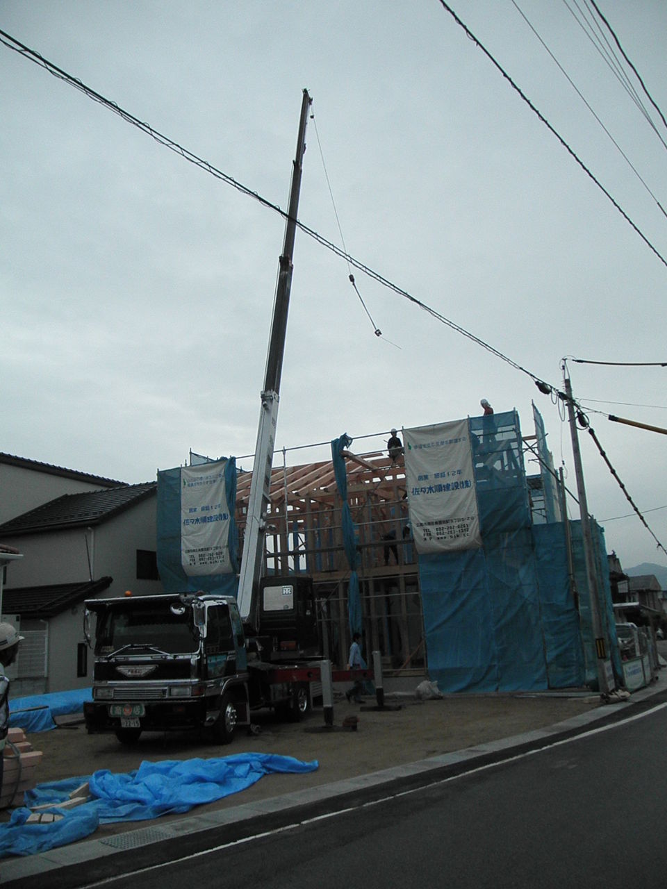 朝早くから棟梁はじめ大工さんが在来軸組み木造の最も重要な部分の柱、梁を