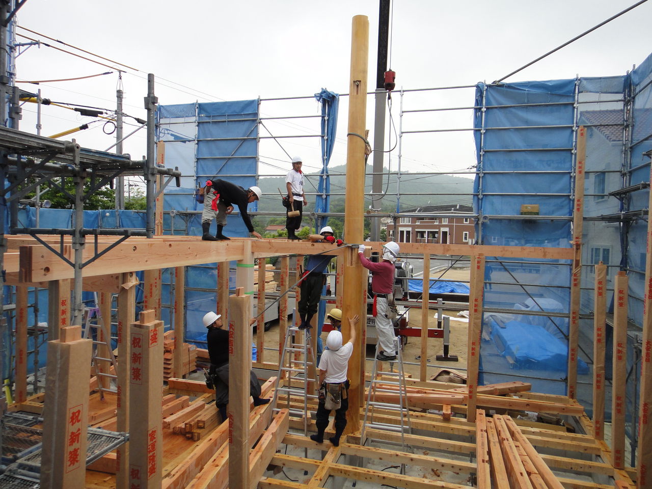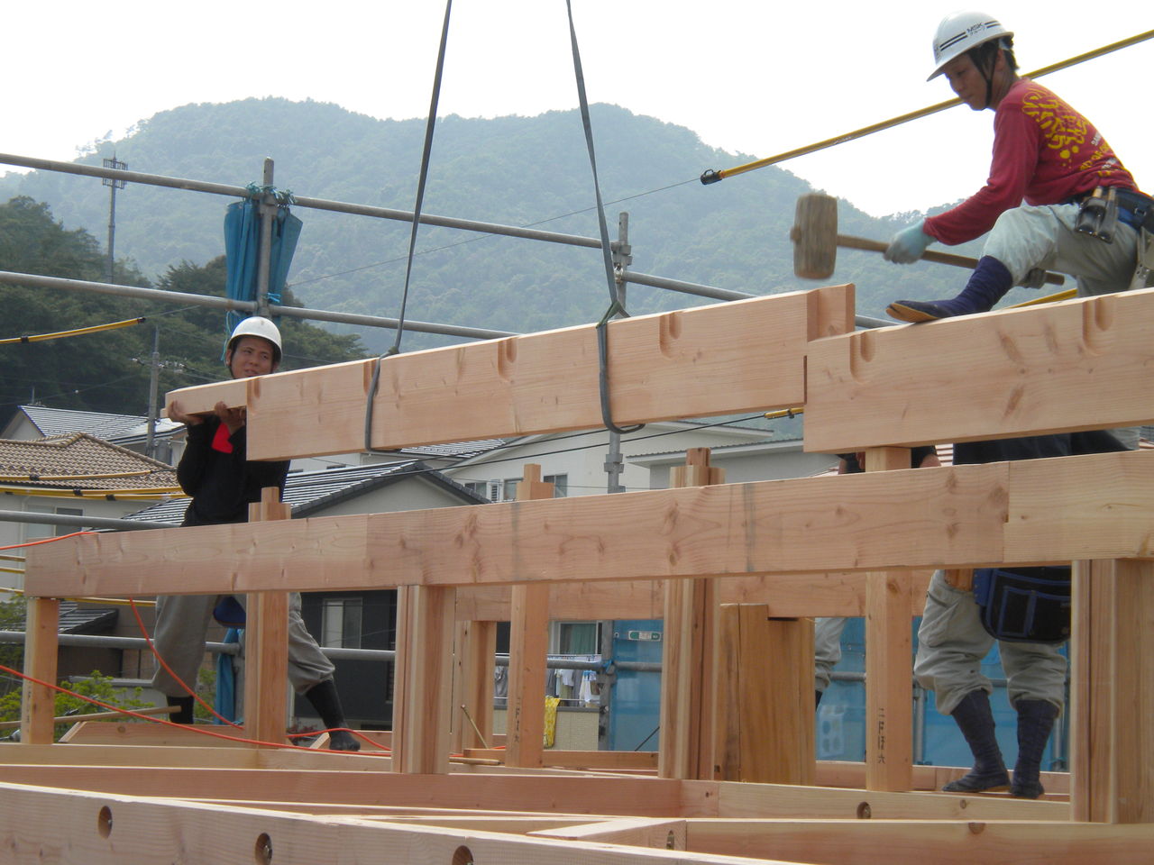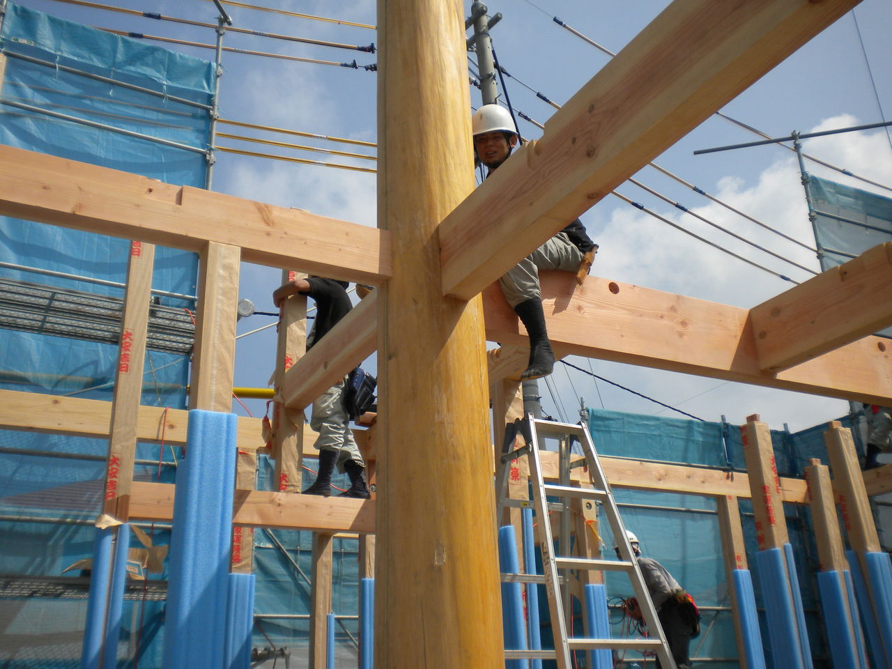 朝早くから棟梁はじめ大工さんが在来軸組み木造の