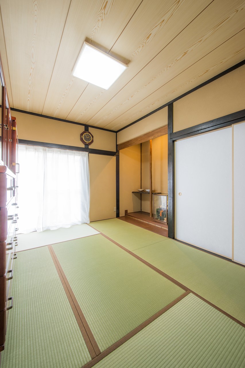 壁天井はハイクリーンボードに越前の和紙の壁紙を貼りました。