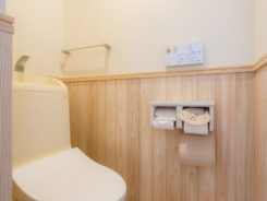 トイレも床には桧板・腰壁も桧板・壁天井には越前の和紙の壁紙を使いました。