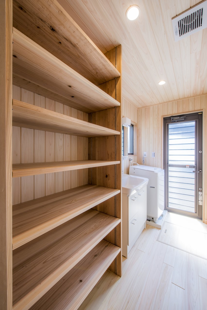 洗濯機置き場、洗面化粧台・ダボレール付きの収納棚までつけました。