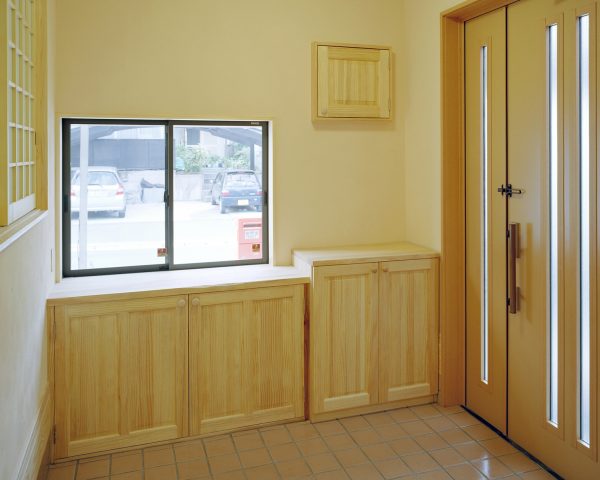 下駄箱は檜(ヒノキ)の無垢材で作ったオリジナル家具。