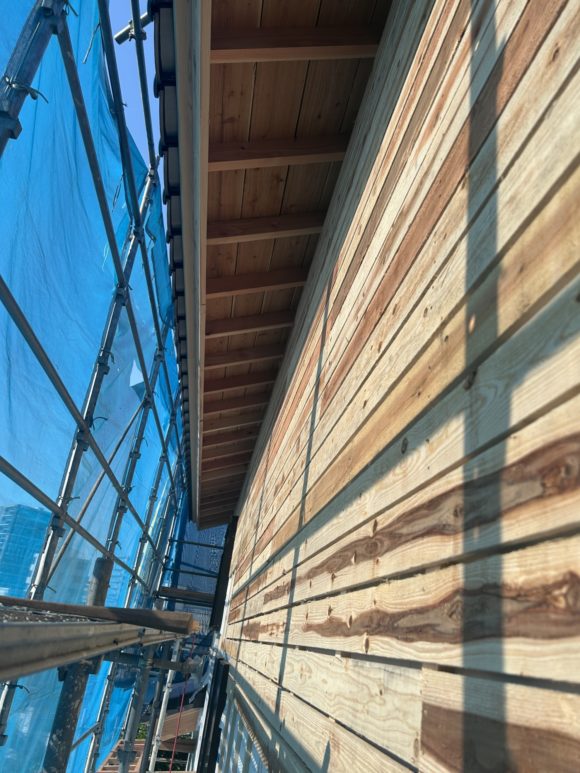 現在外壁は乾式工法のサイデイングが主流となっております。 佐々木順建設では軽量ラスモルタルにアクリルリシンの玉吹きにこだわってしております。 サイデイングは工期が早く価格も安いので建売住宅も採用していますが 目地などのシーリング材の劣化が早くて雨漏れの原因になっております。 メンテナンスフリーのが外壁材はありませんが、 サイデイングに比べると軽量ラスモルタルのアクリルリシンの玉吹き が長持ちします。 弊社の実績では20年から30年は持ちます。 広島市南区東霞町のS邸建て替え工事では熱い猛暑の最中を外壁の耐震ボードを張り終え透湿シートもおわり。 現在は外部の通気胴縁、ラス板張りを大工さんが頑張って施工中です。