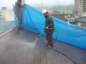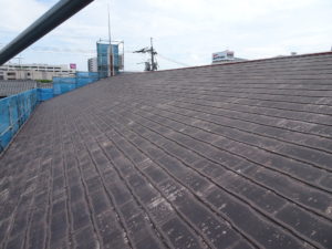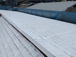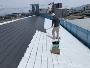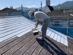 屋根の1回目の上塗をしてます。外壁と同様にもう1回上塗