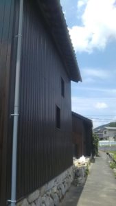 納屋と藏の外壁の木目のプリント鋼板を張りました。
