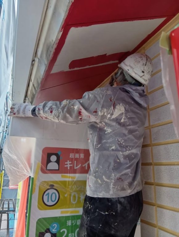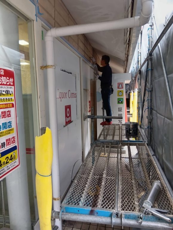 外部塗装工事、軽鉄下地、 PB張り電気配線工事を夜間作業で 施工しています。 午後9時閉店後に夜間作業にて突貫工事を 行っています。