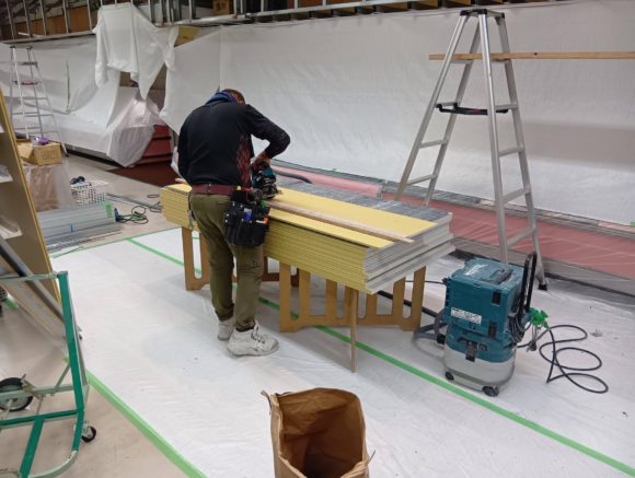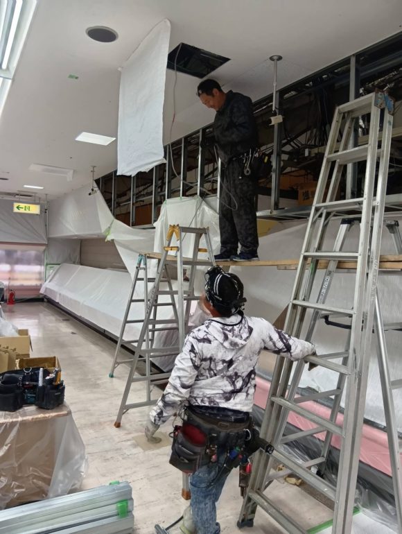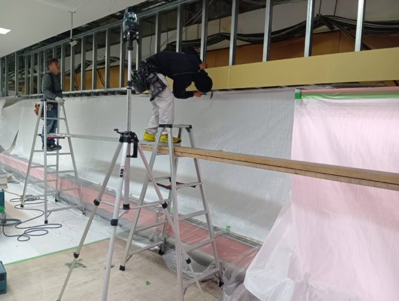 内部解体工事、プラスターボード軽鉄下地組み ボード張り、電気配線工事等複合的に 夜間工事が始まりました。 お店は21時まで開店しております。 工事終了後に毎回クリーニングをして 明日の開店に備えています。