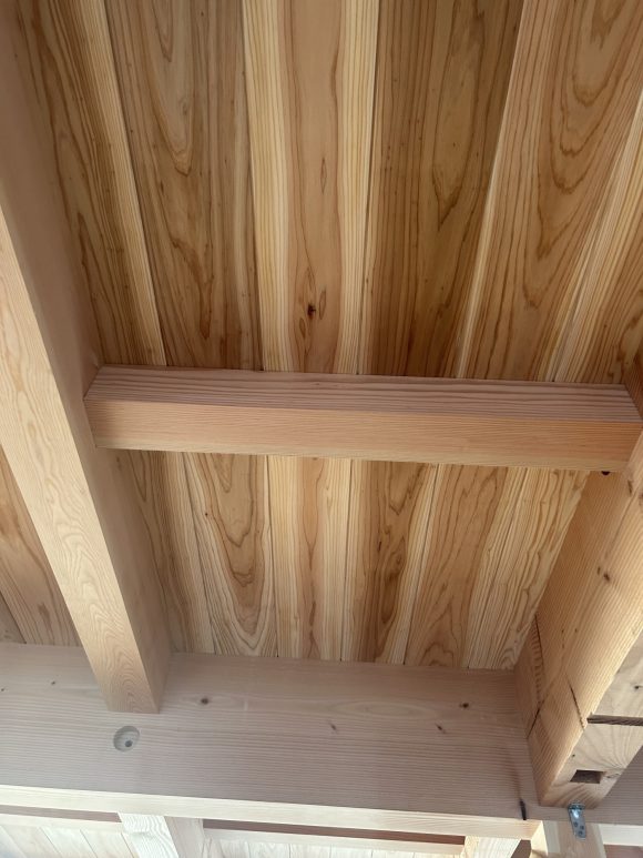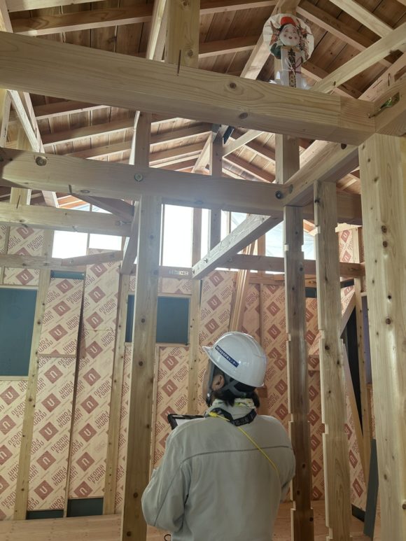 上棟から10日あまり中塚棟梁は朝早くから夕方まで 一所懸命丁寧な仕事をして頂いてます。 棟に御幣をつけて貰いました。 筋交いや金物をつけています。 外壁にタイガーボードのEXハイパー耐震ボードも張っています。 在来工法の最高級の耐震等3を応力度構造計算でとっています。 無垢材の提供のボックスを現場に配置しています。
