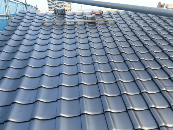 現在屋根工事をしています。 アスファルトルーフィングも敷き瓦を葺いています。 瓦は石州瓦の銀黒を選定しました。 三州瓦のいぶしにしようと思いましたがメインの東南面からみても遠目では銀黒もいぶしも 見た目が変わらないので予算面から石州瓦にしました。 2階の大屋根は棟瓦を残して完了しています。 1階の下家は途中です。 今朝は屋根屋さんは応援が来ています。 明日から雨が続くようです。![]()