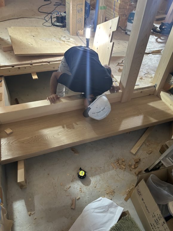 大黒柱のお父さん柱は240角お母さん柱は180角のヒノキの無垢の無節です。