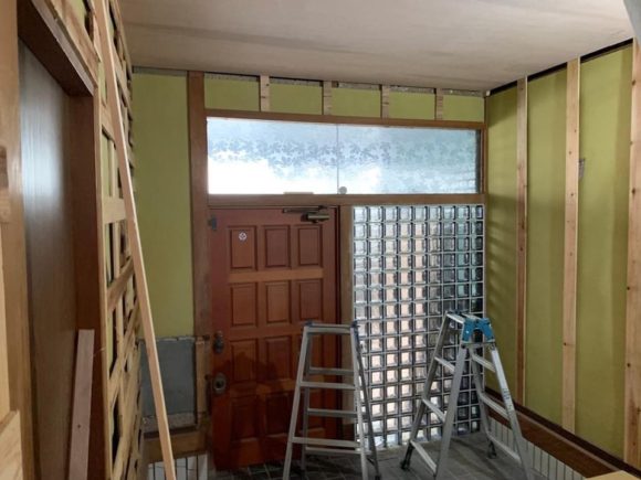 玄関の真壁の聚楽壁を大壁のクロスに替えた為に大壁様の間柱胴縁いれました。