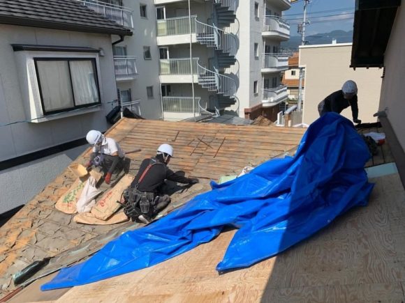 下屋根は横暖ルーフαプレミアムSと言うガルバニュウム鋼板の葺き替え仕様です。 瓦下地の野地板の上に構造用合板12㎜を大工さんが打ちました。