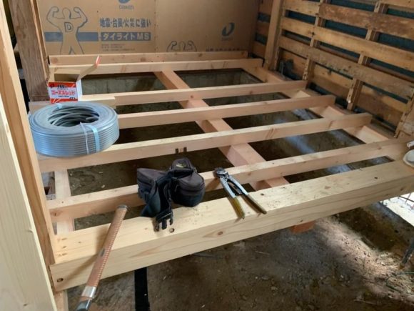 洗面所とトイレの床は土台大引きもやり替えました。国産の桧材を使いました。