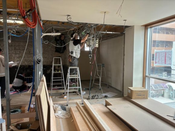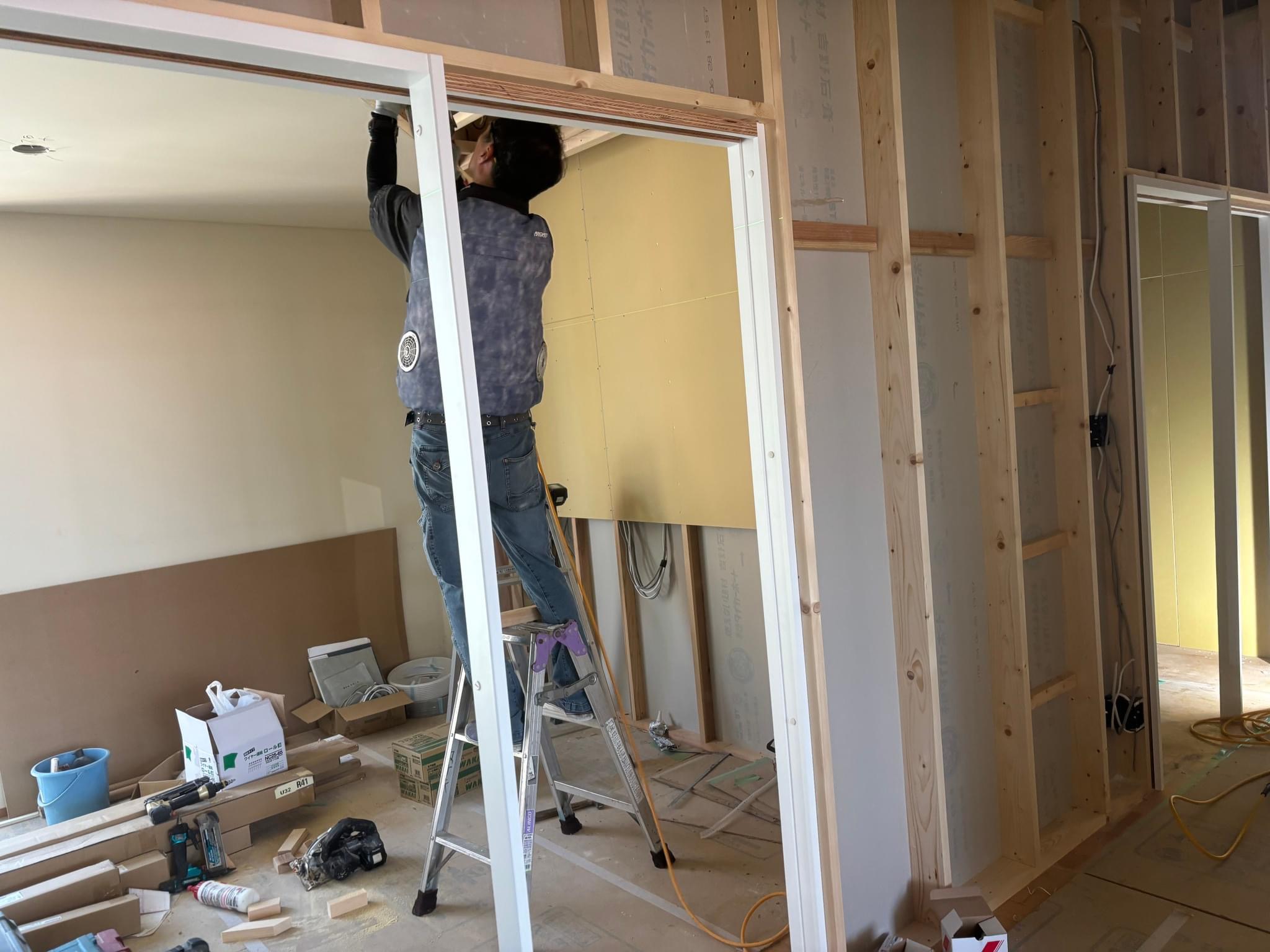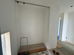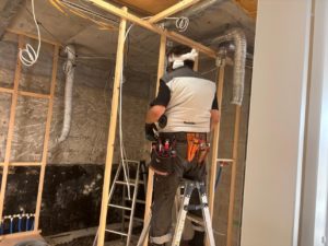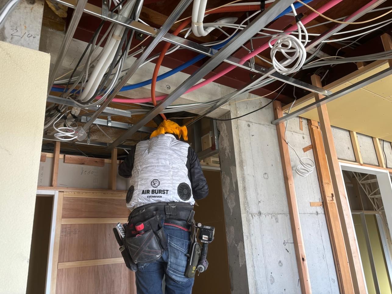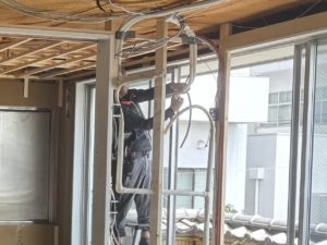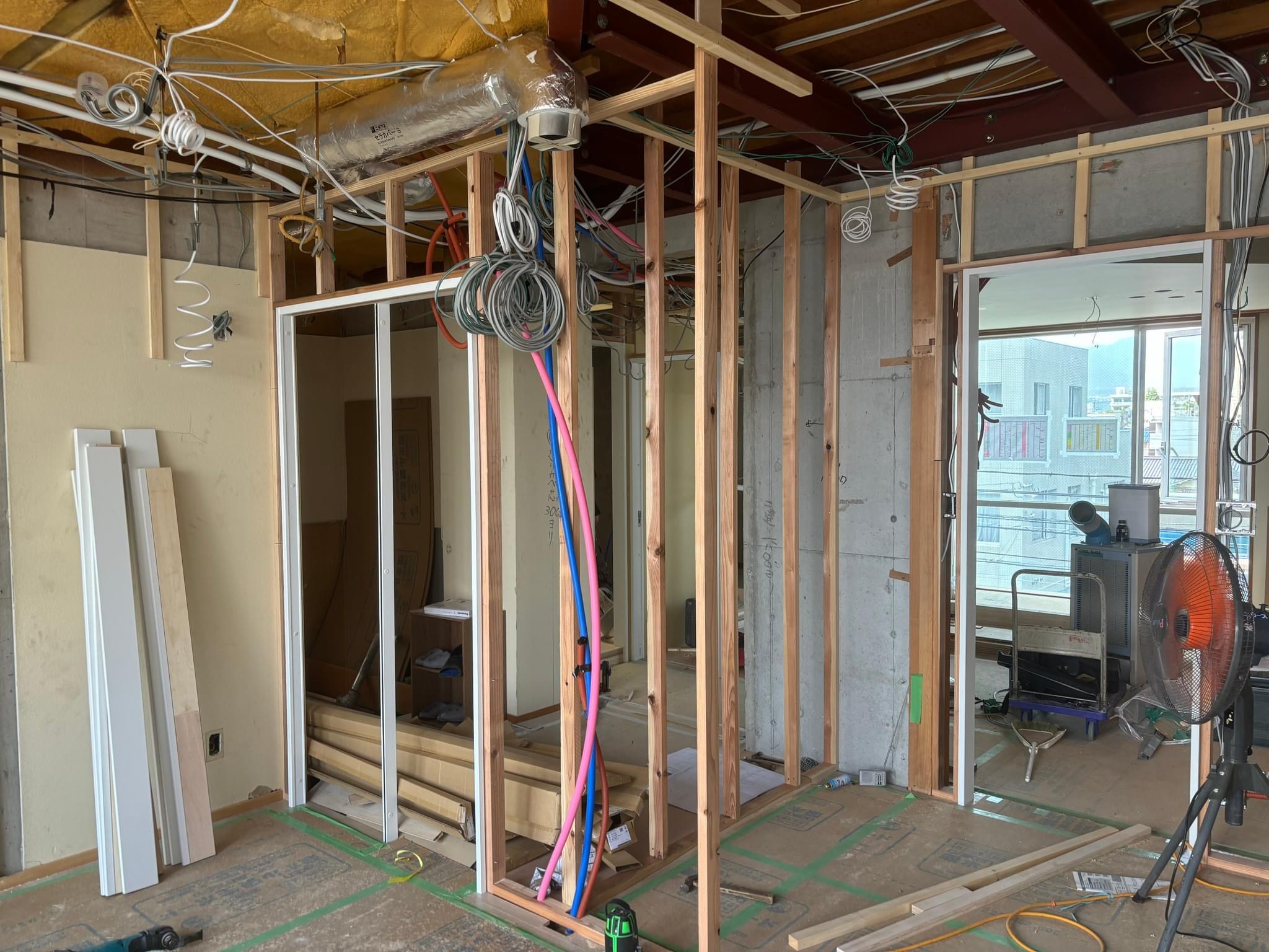 本日は木工事の木枠の取り付け、木下地の組み立て、 電気設備の先行配管をしました。