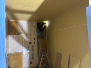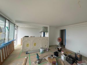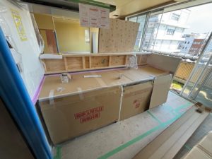 毎日猛暑が続きます。 今日は8月6日79回目の鎮魂の日です。 猛暑の中を大工さんと軽鉄屋さんに頑張って貰っています。 木枠も取り付けしました。 システムキッチンもつけました。