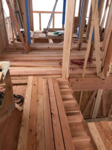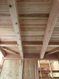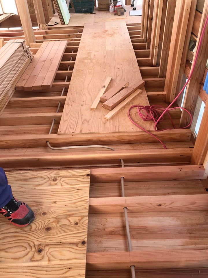 1階天井杉上小化粧板張り・2階根太組・1階床下配管状況です。