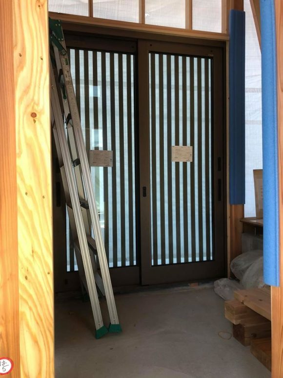 敷居取付・防蟻処理・玄関戸・サッシュ引き違い窓障子取付状況です。