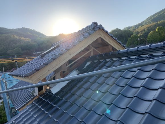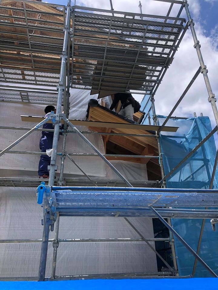 外部では上棟した後、屋根仕舞いをして瓦葺きを行いました。