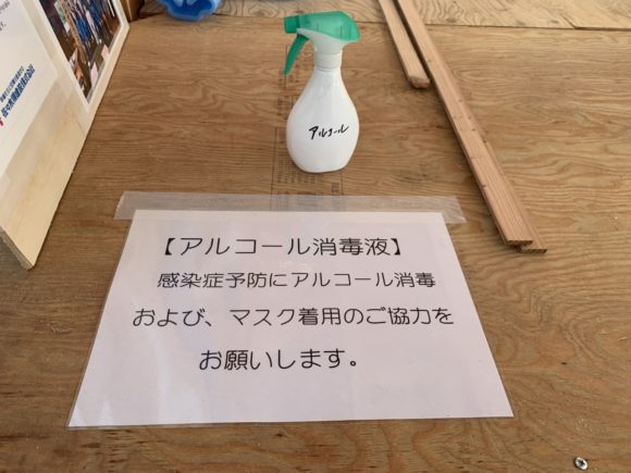 現場にはコロナ感染予防としてアルコールを設置しています。