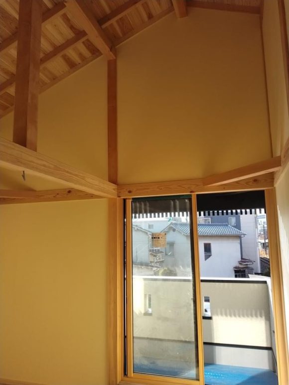 2階の寝室勾配天井は梁の現しです。 壁には越前和紙を貼っています。