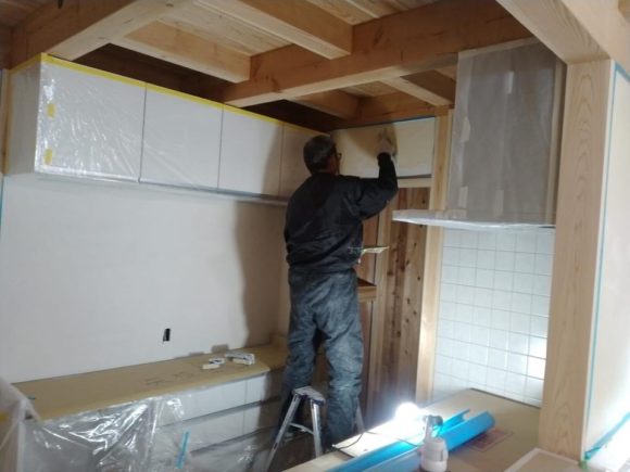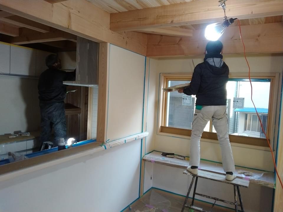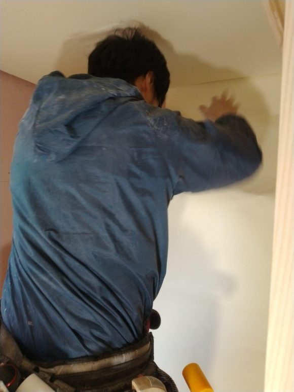 内壁の越前和紙クロスのパテ処理をしています。