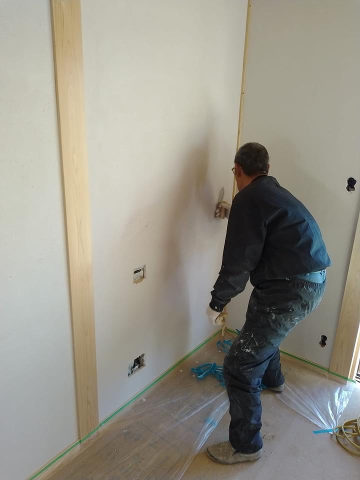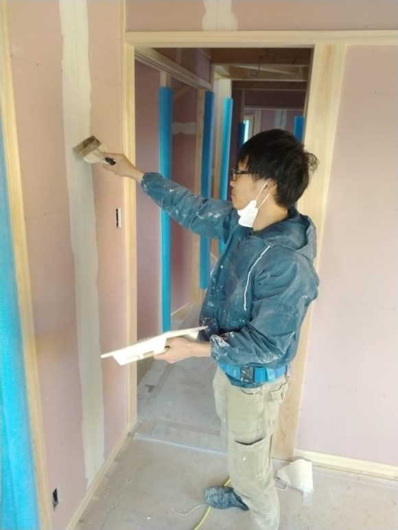 1階のリビングダイニングの珪藻土の下塗りを左官さんがしています。養生期間をしっかり取り正月明けに仕上げをします。