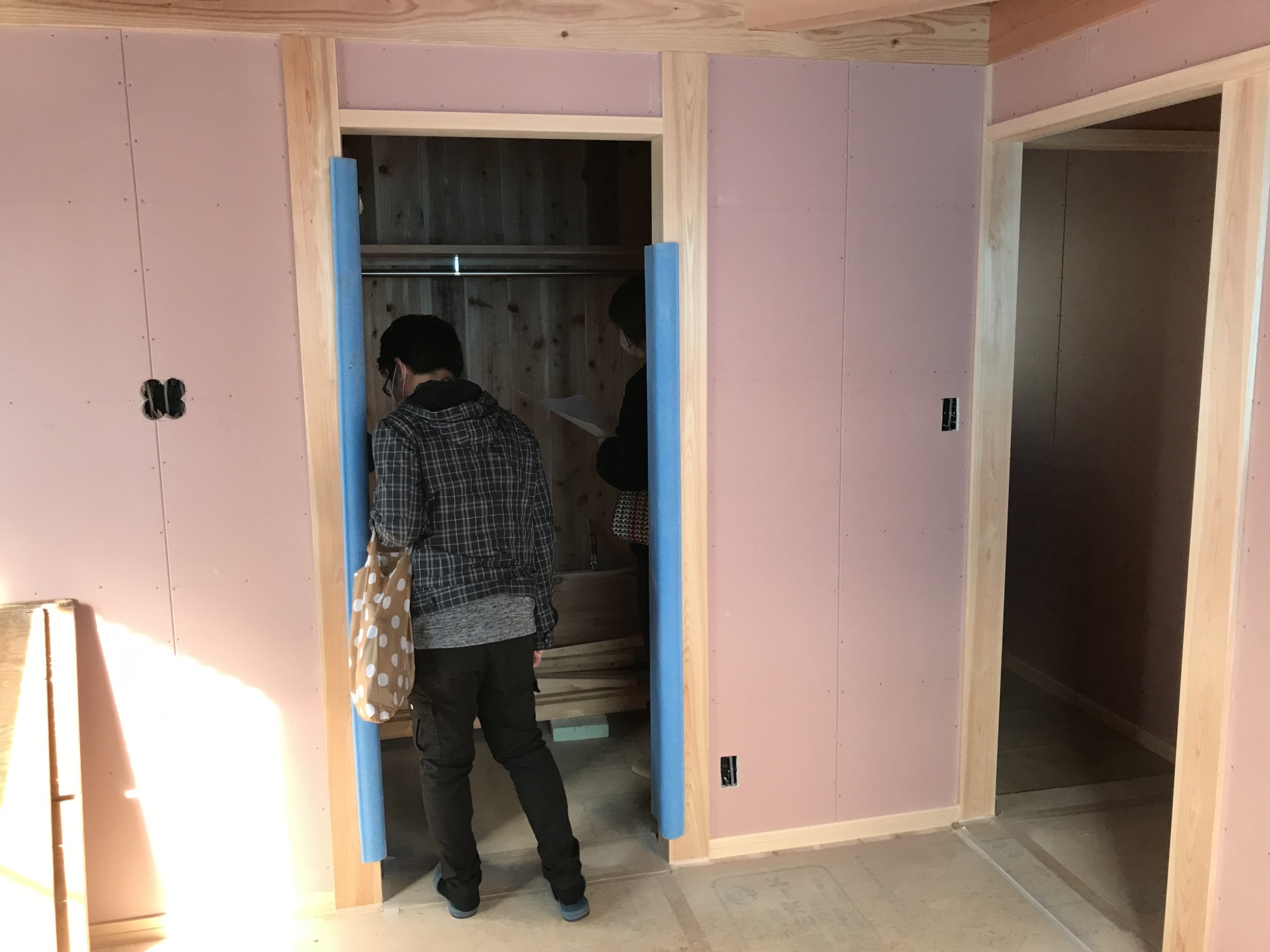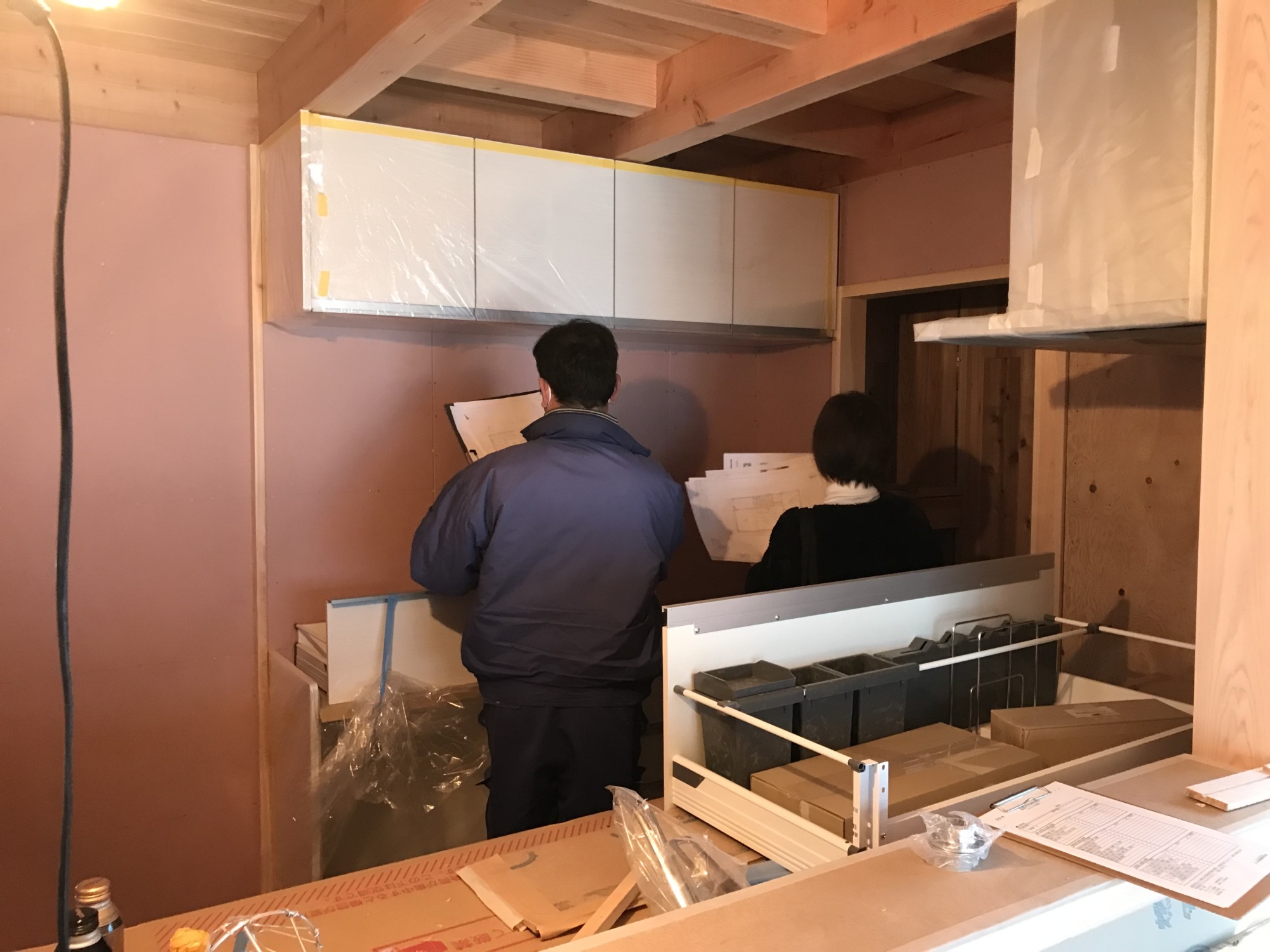 本日はお客様立ち会いの木工事の完了検査がありました。 未決定の収納の棚の細かな打ち合せもさせて頂きました。