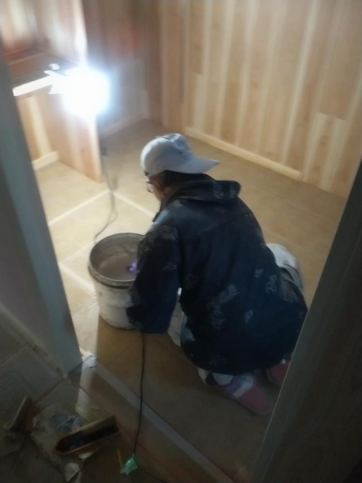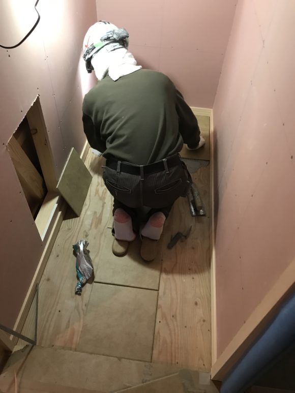 タイル屋さんがタイル工事に入っています。 2階のトイレの300角のデザインタイルを張っています。