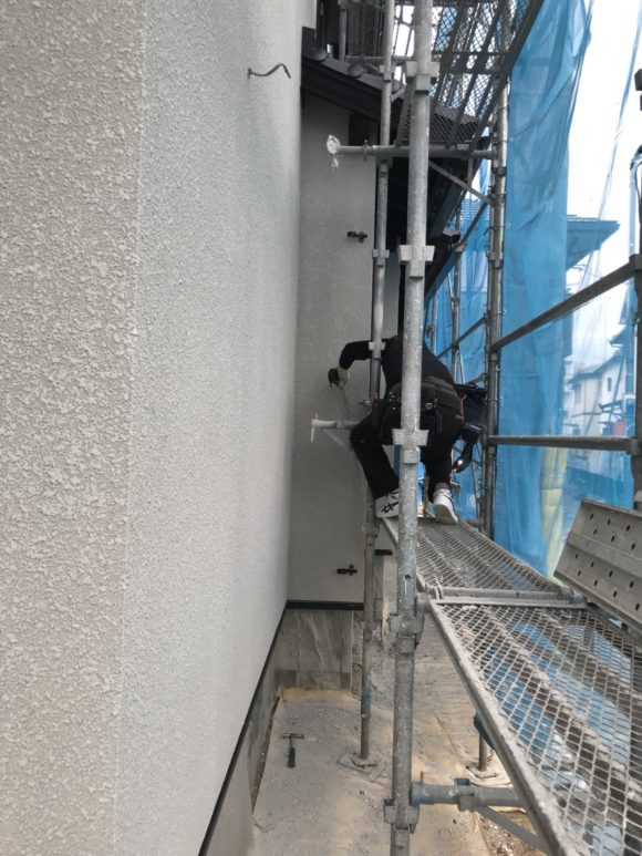 外壁のアクリルリシンの玉吹き工事も終わり、板金屋さんがトイを取り付けています。