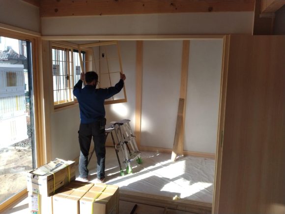 和室の中連窓に内障子をはめ込んでいます。 和室は真壁で壁には京壁ではなくて珪藻土の仕上げです。