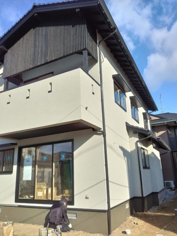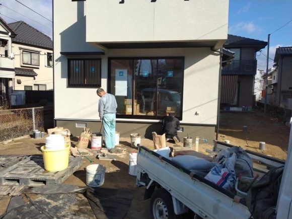 外部の基礎の立ち上がりをモルタル刷毛引きで仕上げています。