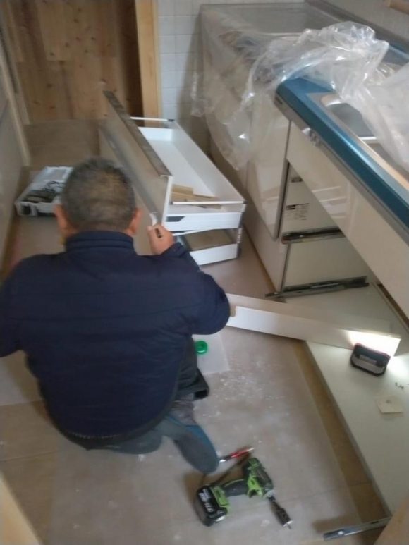 キッチンの給排水のつなぎを設備屋さんがしています。