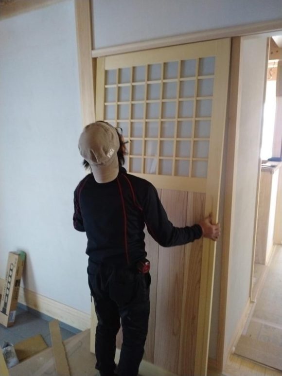 玄関ホールとリビングの建具を切りはめしています。 両面組子の腰板付の框戸です。 オリジナルデザインで昔ながらの建具屋さんが手造りしています。