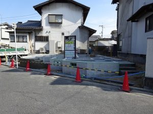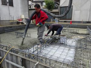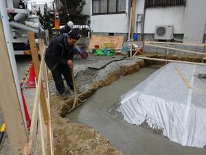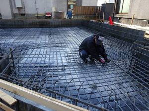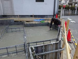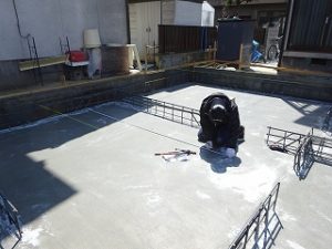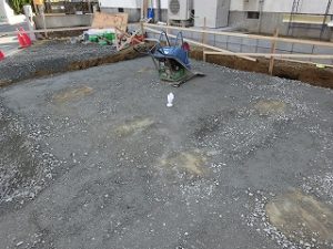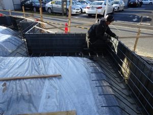 そして、防湿の為にシートを張って、捨てコン打設です。 コンクリートが固まったら、型枠を建てて、鉄筋組みです。