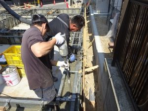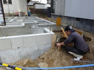 土間コンクリートが乾いたら、墨出しをして、立上りの型枠を組んでいきます。型枠を組んで、動かない様に固定をしたら、