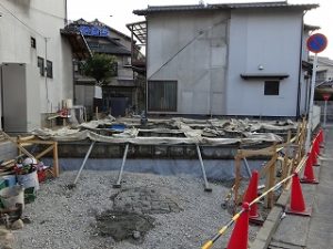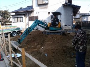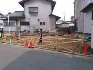 地盤改良も無事終わり、基礎を造りますまずは、 ”遣り方” を行います。これは図面通りの位置に配置する為の確認作業です。遣り方が終わると、早速掘削です。 今回は、3階建てなので、基礎が今までと多少違います。 形も出入りがある建物なので、気をつけて・・・
