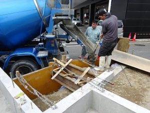 ご通行中の皆様にはご迷惑をおかけしました。 土間の天端をコテで均して終了です。