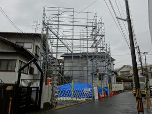 上棟の前日に外部足場を組みました。生憎の空模様でしたが、無事に組み終わりいよいよ、上棟日です。まずは、棟梁によるお清めをして工事の無事を祈願、