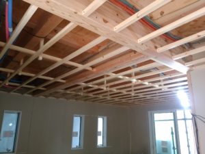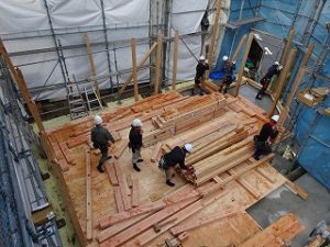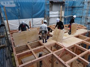 1フロア毎に構造合板で床を張っていきます。これで転落の心配が減ります。