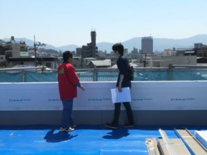 さて、作業開始です。レッカー車を使用して材料を揚げながらの作業です。
