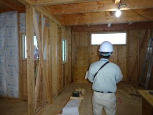 地震等で倒壊しない様に構造計算された位置に指定の筋違や金物をつけていきます。